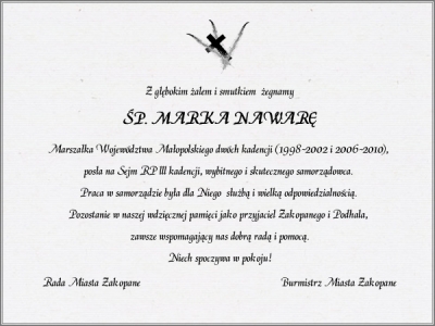 Podhale24.pl zastrzega sobie prawo do nie publikowania wspomnień, w szczególności tych nie związanych z profilem działu nekrologi, zawierających wulgaryzmy, wzywających do zachowań niezgodnych z prawem, obrażających osoby publiczne i prywatne, obrażających inne narodowości, rasy, religie itd, oraz te, bez możliwości telefonicznej lub mailowej weryfikacji ich autora.