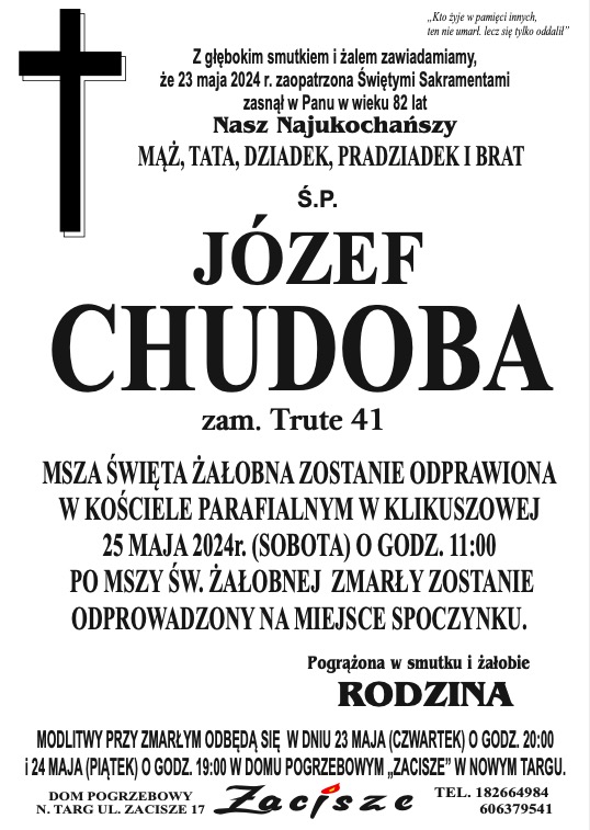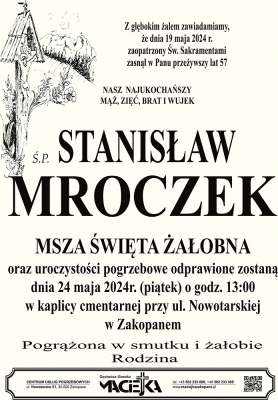 Podhale24.pl zastrzega sobie prawo do nie publikowania wspomnień, w szczególności tych nie związanych z profilem działu nekrologi, zawierających wulgaryzmy, wzywających do zachowań niezgodnych z prawem, obrażających osoby publiczne i prywatne, obrażających inne narodowości, rasy, religie itd, oraz te, bez możliwości telefonicznej lub mailowej weryfikacji ich autora.