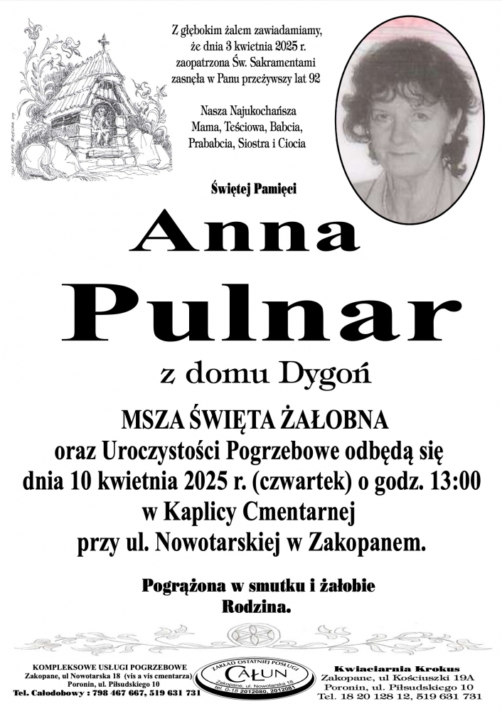 Podhale24.pl zastrzega sobie prawo do nie publikowania wspomnień, w szczególności tych nie związanych z profilem działu nekrologi, zawierających wulgaryzmy, wzywających do zachowań niezgodnych z prawem, obrażających osoby publiczne i prywatne, obrażających inne narodowości, rasy, religie itd, oraz te, bez możliwości telefonicznej lub mailowej weryfikacji ich autora.