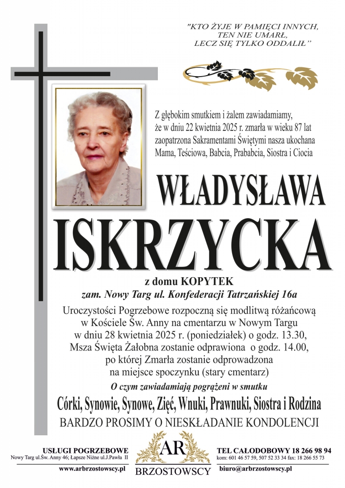 Władysława Iskrzycka - Nekrologi - podhale24.pl