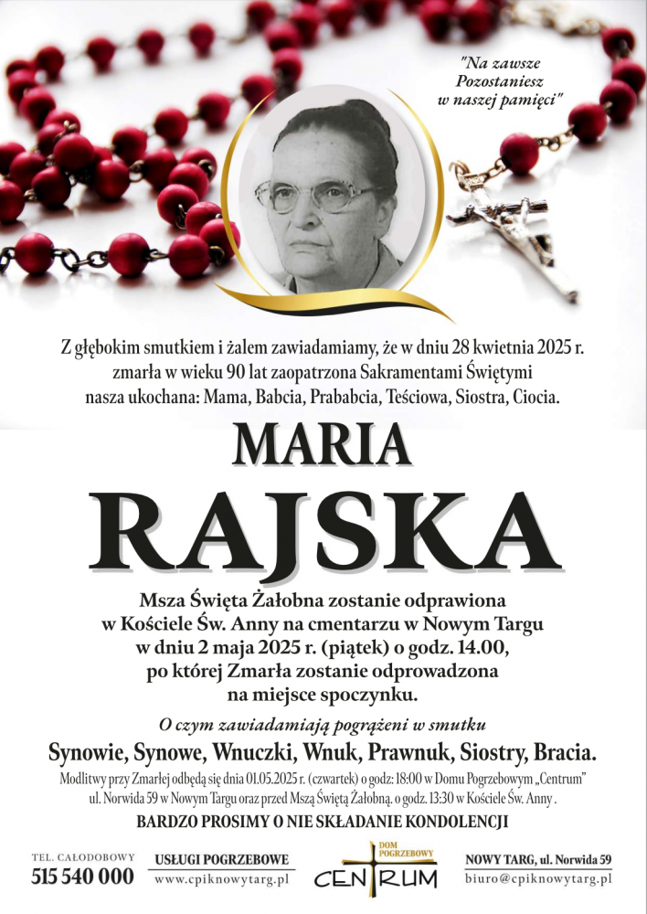 Podhale24.pl zastrzega sobie prawo do nie publikowania wspomnień, w szczególności tych nie związanych z profilem działu nekrologi, zawierających wulgaryzmy, wzywających do zachowań niezgodnych z prawem, obrażających osoby publiczne i prywatne, obrażających inne narodowości, rasy, religie itd, oraz te, bez możliwości telefonicznej lub mailowej weryfikacji ich autora.