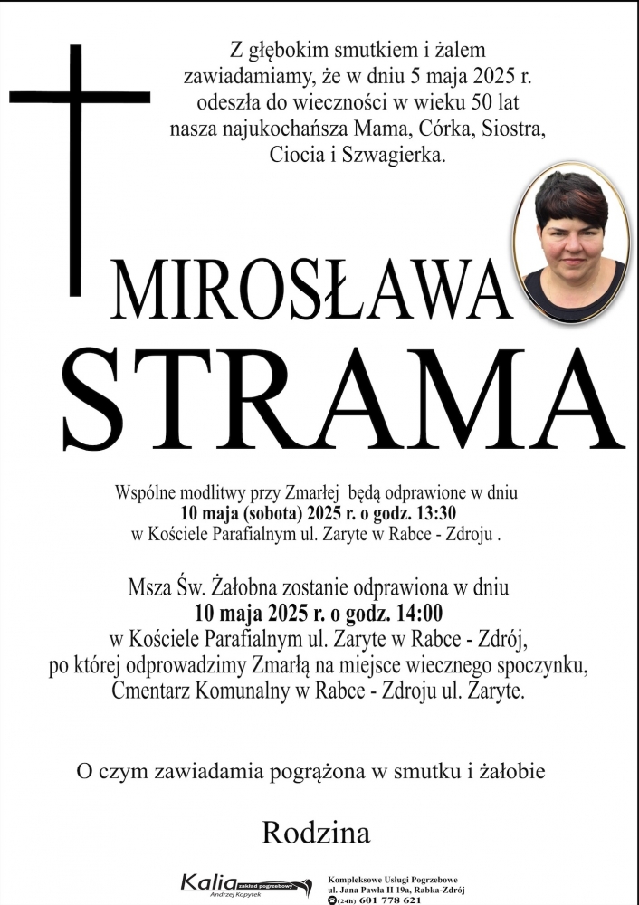 Podhale24.pl zastrzega sobie prawo do nie publikowania wspomnień, w szczególności tych nie związanych z profilem działu nekrologi, zawierających wulgaryzmy, wzywających do zachowań niezgodnych z prawem, obrażających osoby publiczne i prywatne, obrażających inne narodowości, rasy, religie itd, oraz te, bez możliwości telefonicznej lub mailowej weryfikacji ich autora.