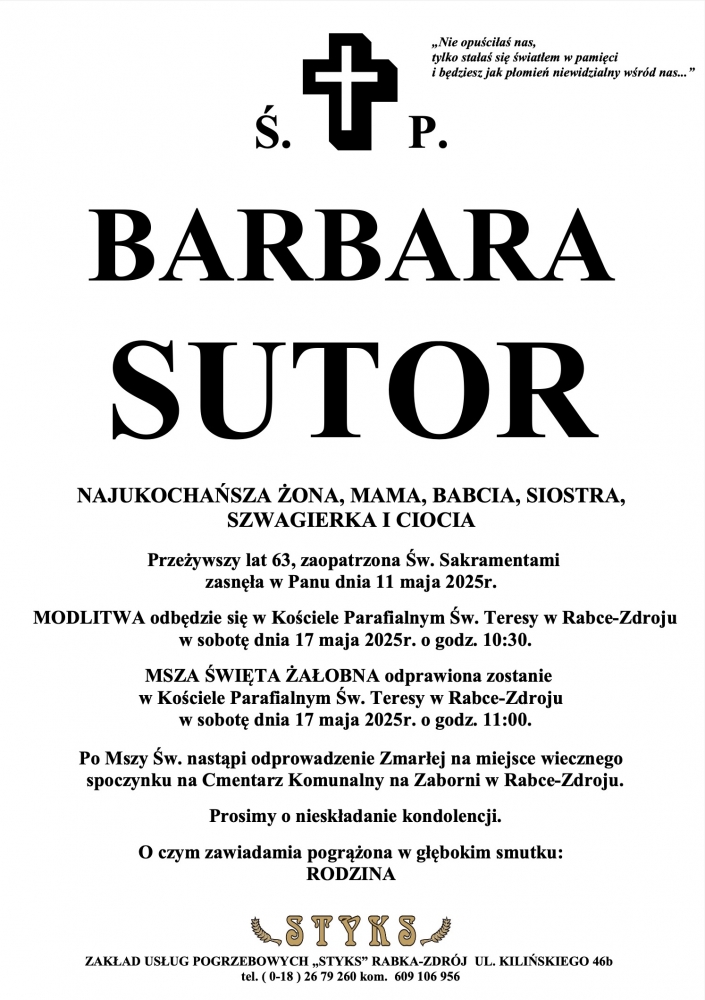 Podhale24.pl zastrzega sobie prawo do nie publikowania wspomnień, w szczególności tych nie związanych z profilem działu nekrologi, zawierających wulgaryzmy, wzywających do zachowań niezgodnych z prawem, obrażających osoby publiczne i prywatne, obrażających inne narodowości, rasy, religie itd, oraz te, bez możliwości telefonicznej lub mailowej weryfikacji ich autora.