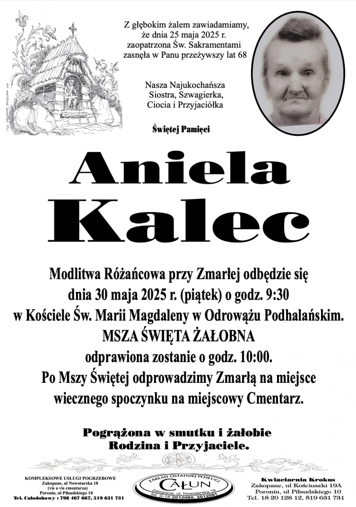 Podhale24.pl zastrzega sobie prawo do nie publikowania wspomnień, w szczególności tych nie związanych z profilem działu nekrologi, zawierających wulgaryzmy, wzywających do zachowań niezgodnych z prawem, obrażających osoby publiczne i prywatne, obrażających inne narodowości, rasy, religie itd, oraz te, bez możliwości telefonicznej lub mailowej weryfikacji ich autora.