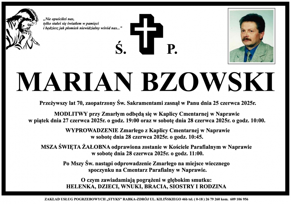 Podhale24.pl zastrzega sobie prawo do nie publikowania wspomnień, w szczególności tych nie związanych z profilem działu nekrologi, zawierających wulgaryzmy, wzywających do zachowań niezgodnych z prawem, obrażających osoby publiczne i prywatne, obrażających inne narodowości, rasy, religie itd, oraz te, bez możliwości telefonicznej lub mailowej weryfikacji ich autora.