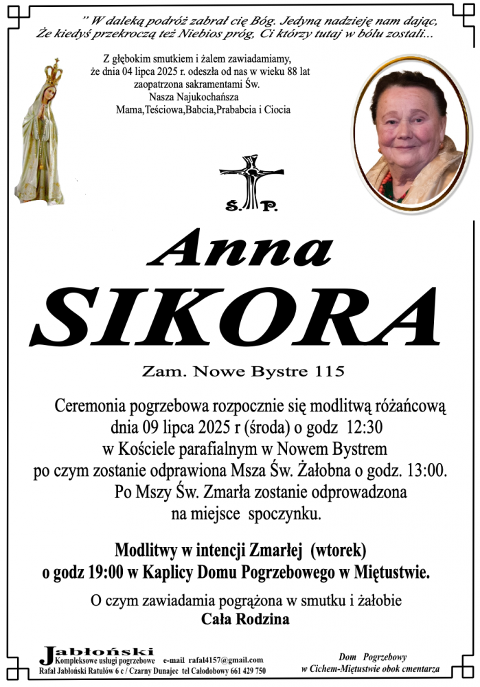 Podhale24.pl zastrzega sobie prawo do nie publikowania wspomnień, w szczególności tych nie związanych z profilem działu nekrologi, zawierających wulgaryzmy, wzywających do zachowań niezgodnych z prawem, obrażających osoby publiczne i prywatne, obrażających inne narodowości, rasy, religie itd, oraz te, bez możliwości telefonicznej lub mailowej weryfikacji ich autora.