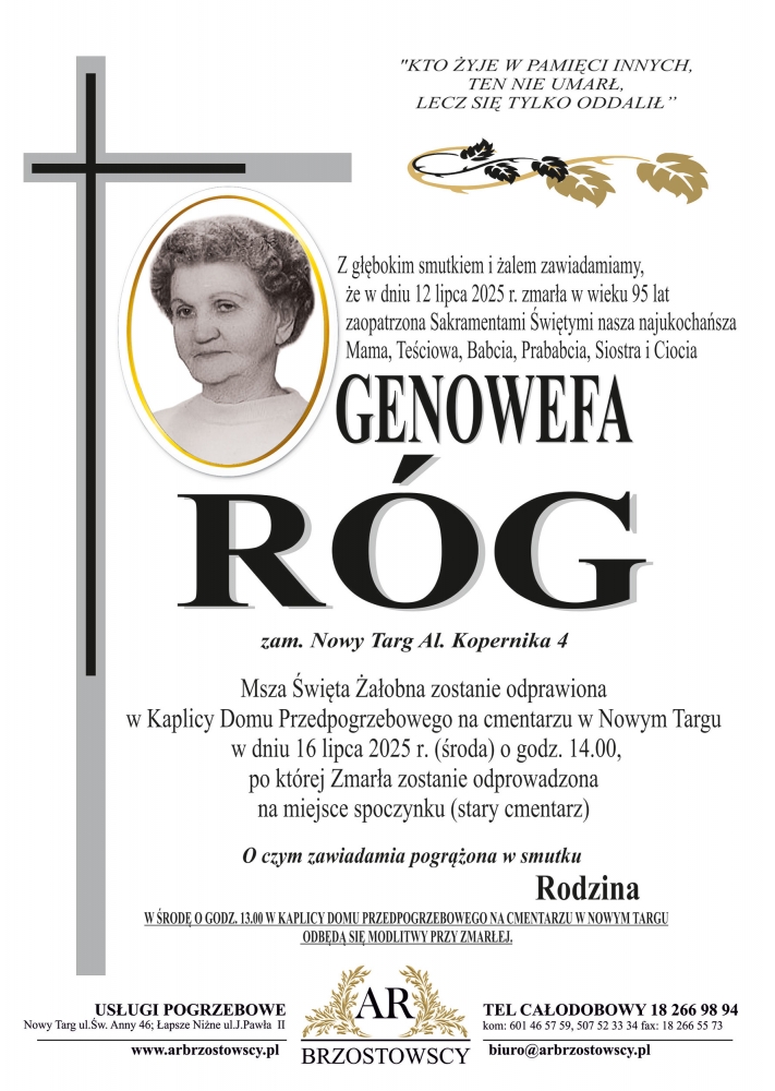 Podhale24.pl zastrzega sobie prawo do nie publikowania wspomnień, w szczególności tych nie związanych z profilem działu nekrologi, zawierających wulgaryzmy, wzywających do zachowań niezgodnych z prawem, obrażających osoby publiczne i prywatne, obrażających inne narodowości, rasy, religie itd, oraz te, bez możliwości telefonicznej lub mailowej weryfikacji ich autora.