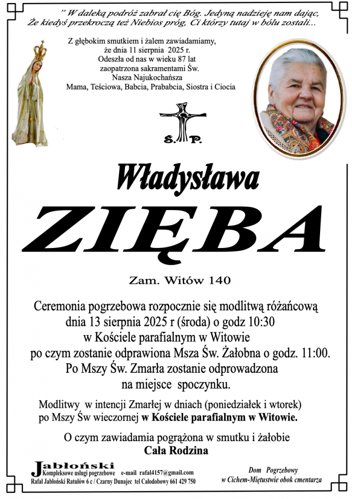 Podhale24.pl zastrzega sobie prawo do nie publikowania wspomnień, w szczególności tych nie związanych z profilem działu nekrologi, zawierających wulgaryzmy, wzywających do zachowań niezgodnych z prawem, obrażających osoby publiczne i prywatne, obrażających inne narodowości, rasy, religie itd, oraz te, bez możliwości telefonicznej lub mailowej weryfikacji ich autora.