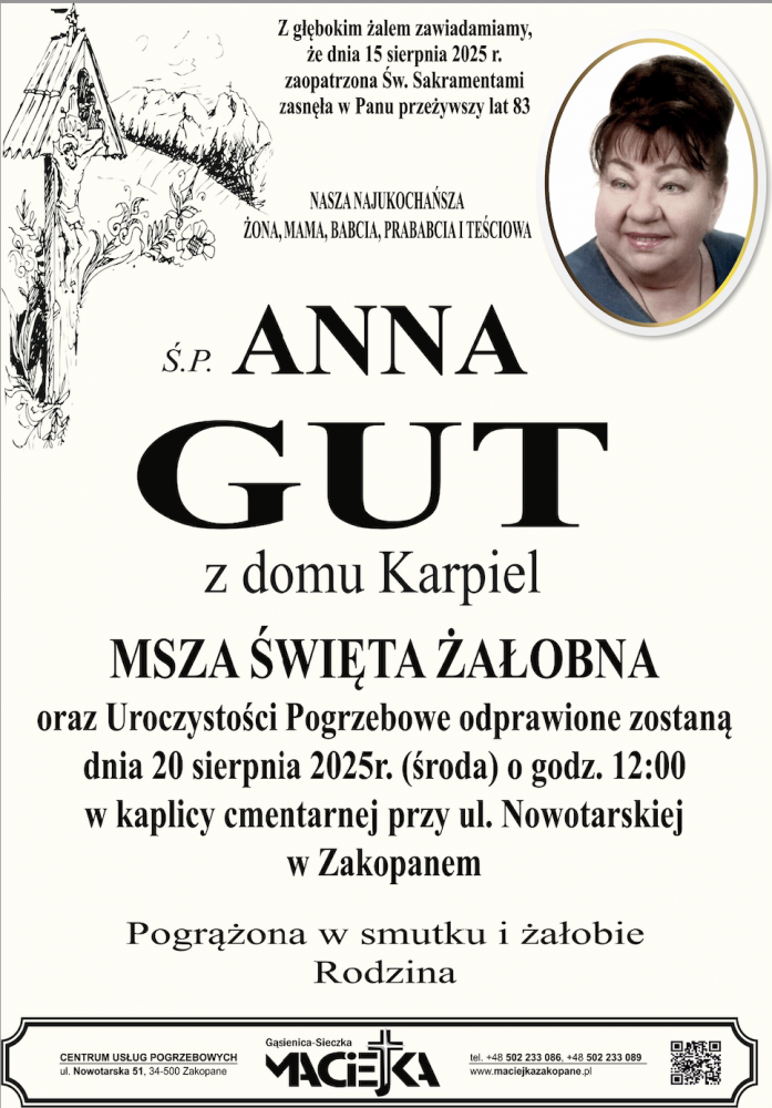 Podhale24.pl zastrzega sobie prawo do nie publikowania wspomnień, w szczególności tych nie związanych z profilem działu nekrologi, zawierających wulgaryzmy, wzywających do zachowań niezgodnych z prawem, obrażających osoby publiczne i prywatne, obrażających inne narodowości, rasy, religie itd, oraz te, bez możliwości telefonicznej lub mailowej weryfikacji ich autora.