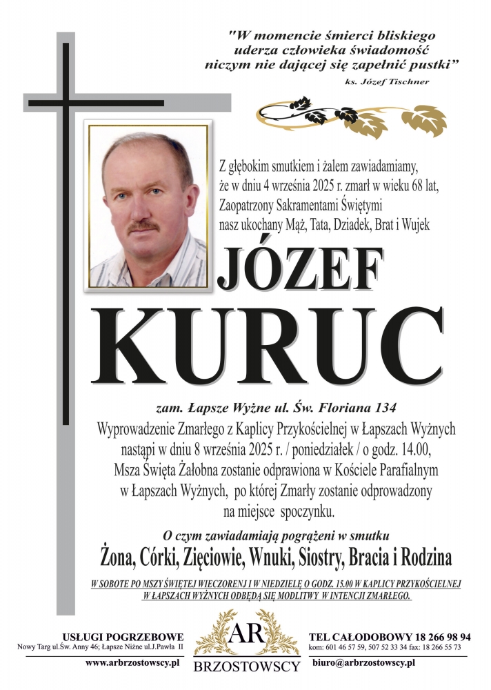 Podhale24.pl zastrzega sobie prawo do nie publikowania wspomnień, w szczególności tych nie związanych z profilem działu nekrologi, zawierających wulgaryzmy, wzywających do zachowań niezgodnych z prawem, obrażających osoby publiczne i prywatne, obrażających inne narodowości, rasy, religie itd, oraz te, bez możliwości telefonicznej lub mailowej weryfikacji ich autora.