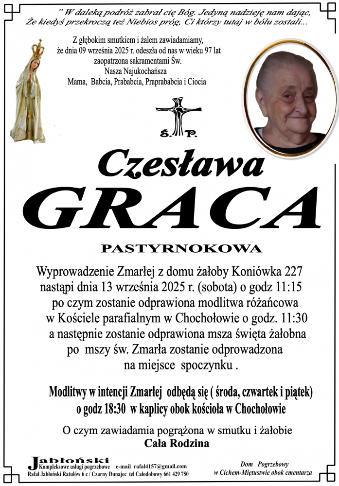 Podhale24.pl zastrzega sobie prawo do nie publikowania wspomnień, w szczególności tych nie związanych z profilem działu nekrologi, zawierających wulgaryzmy, wzywających do zachowań niezgodnych z prawem, obrażających osoby publiczne i prywatne, obrażających inne narodowości, rasy, religie itd, oraz te, bez możliwości telefonicznej lub mailowej weryfikacji ich autora.