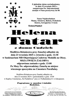 Podhale24.pl zastrzega sobie prawo do nie publikowania wspomnień, w szczególności tych nie związanych z profilem działu nekrologi, zawierających wulgaryzmy, wzywających do zachowań niezgodnych z prawem, obrażających osoby publiczne i prywatne, obrażających inne narodowości, rasy, religie itd, oraz te, bez możliwości telefonicznej lub mailowej weryfikacji ich autora.