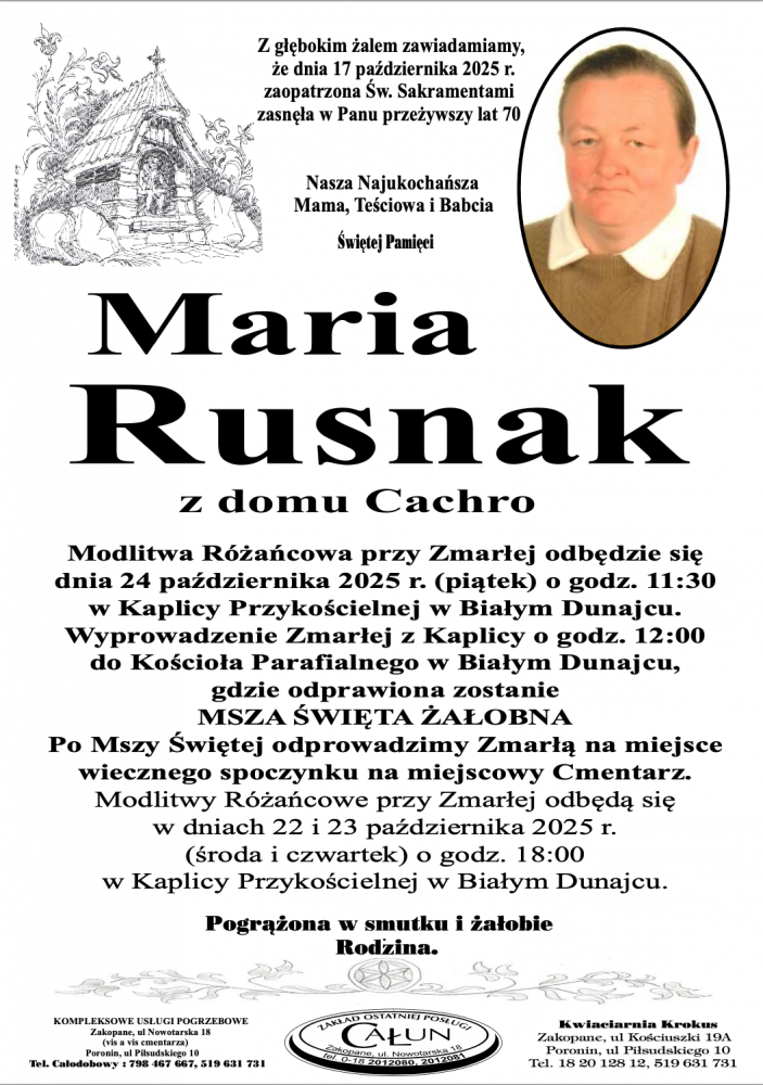 Podhale24.pl zastrzega sobie prawo do nie publikowania wspomnień, w szczególności tych nie związanych z profilem działu nekrologi, zawierających wulgaryzmy, wzywających do zachowań niezgodnych z prawem, obrażających osoby publiczne i prywatne, obrażających inne narodowości, rasy, religie itd, oraz te, bez możliwości telefonicznej lub mailowej weryfikacji ich autora.
