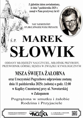 Podhale24.pl zastrzega sobie prawo do nie publikowania wspomnień, w szczególności tych nie związanych z profilem działu nekrologi, zawierających wulgaryzmy, wzywających do zachowań niezgodnych z prawem, obrażających osoby publiczne i prywatne, obrażających inne narodowości, rasy, religie itd, oraz te, bez możliwości telefonicznej lub mailowej weryfikacji ich autora.