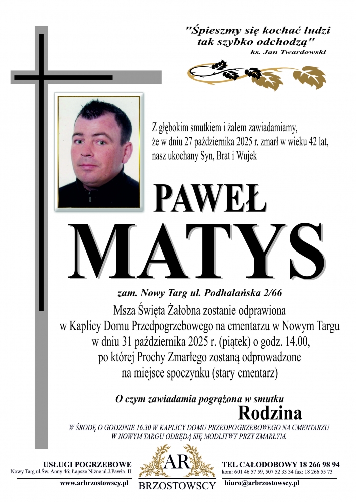 Podhale24.pl zastrzega sobie prawo do nie publikowania wspomnień, w szczególności tych nie związanych z profilem działu nekrologi, zawierających wulgaryzmy, wzywających do zachowań niezgodnych z prawem, obrażających osoby publiczne i prywatne, obrażających inne narodowości, rasy, religie itd, oraz te, bez możliwości telefonicznej lub mailowej weryfikacji ich autora.
