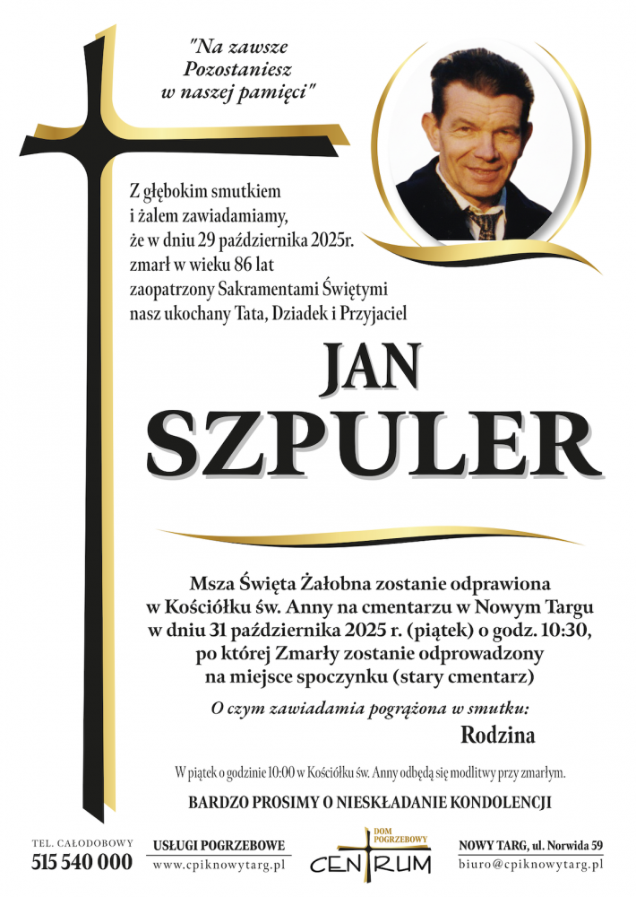 Podhale24.pl zastrzega sobie prawo do nie publikowania wspomnień, w szczególności tych nie związanych z profilem działu nekrologi, zawierających wulgaryzmy, wzywających do zachowań niezgodnych z prawem, obrażających osoby publiczne i prywatne, obrażających inne narodowości, rasy, religie itd, oraz te, bez możliwości telefonicznej lub mailowej weryfikacji ich autora.