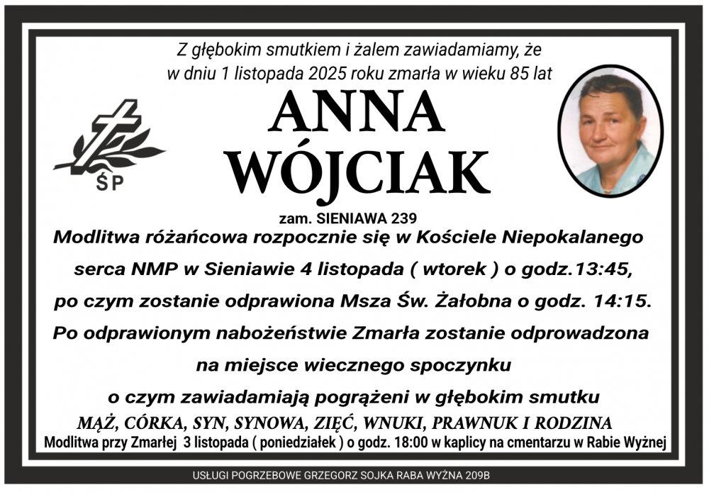 Podhale24.pl zastrzega sobie prawo do nie publikowania wspomnień, w szczególności tych nie związanych z profilem działu nekrologi, zawierających wulgaryzmy, wzywających do zachowań niezgodnych z prawem, obrażających osoby publiczne i prywatne, obrażających inne narodowości, rasy, religie itd, oraz te, bez możliwości telefonicznej lub mailowej weryfikacji ich autora.