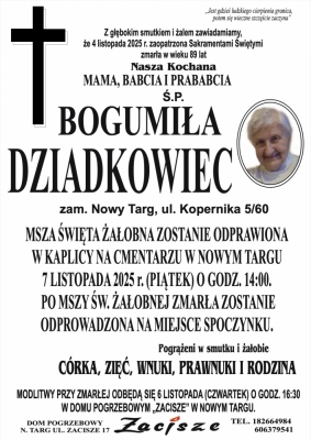Podhale24.pl zastrzega sobie prawo do nie publikowania wspomnień, w szczególności tych nie związanych z profilem działu nekrologi, zawierających wulgaryzmy, wzywających do zachowań niezgodnych z prawem, obrażających osoby publiczne i prywatne, obrażających inne narodowości, rasy, religie itd, oraz te, bez możliwości telefonicznej lub mailowej weryfikacji ich autora.