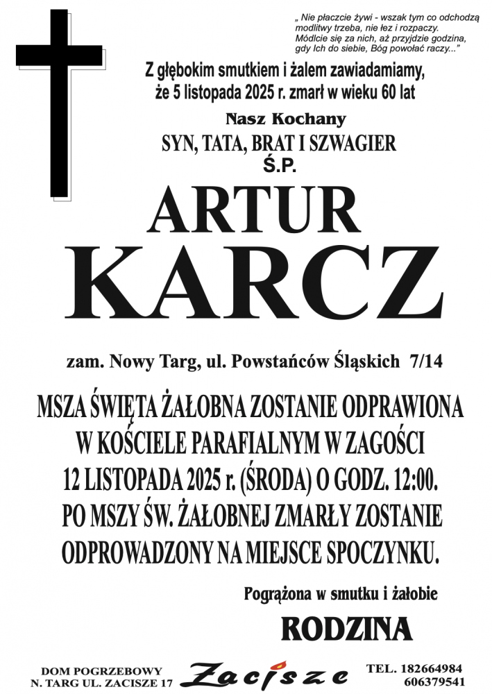 Podhale24.pl zastrzega sobie prawo do nie publikowania wspomnień, w szczególności tych nie związanych z profilem działu nekrologi, zawierających wulgaryzmy, wzywających do zachowań niezgodnych z prawem, obrażających osoby publiczne i prywatne, obrażających inne narodowości, rasy, religie itd, oraz te, bez możliwości telefonicznej lub mailowej weryfikacji ich autora.