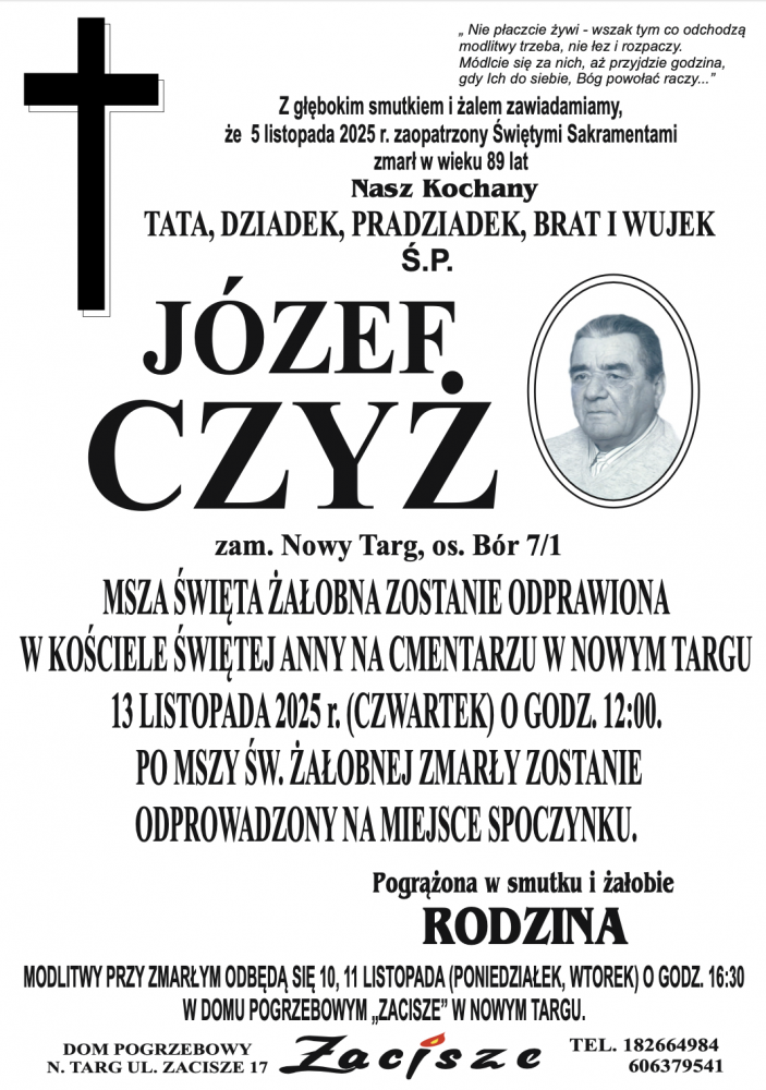 Podhale24.pl zastrzega sobie prawo do nie publikowania wspomnień, w szczególności tych nie związanych z profilem działu nekrologi, zawierających wulgaryzmy, wzywających do zachowań niezgodnych z prawem, obrażających osoby publiczne i prywatne, obrażających inne narodowości, rasy, religie itd, oraz te, bez możliwości telefonicznej lub mailowej weryfikacji ich autora.