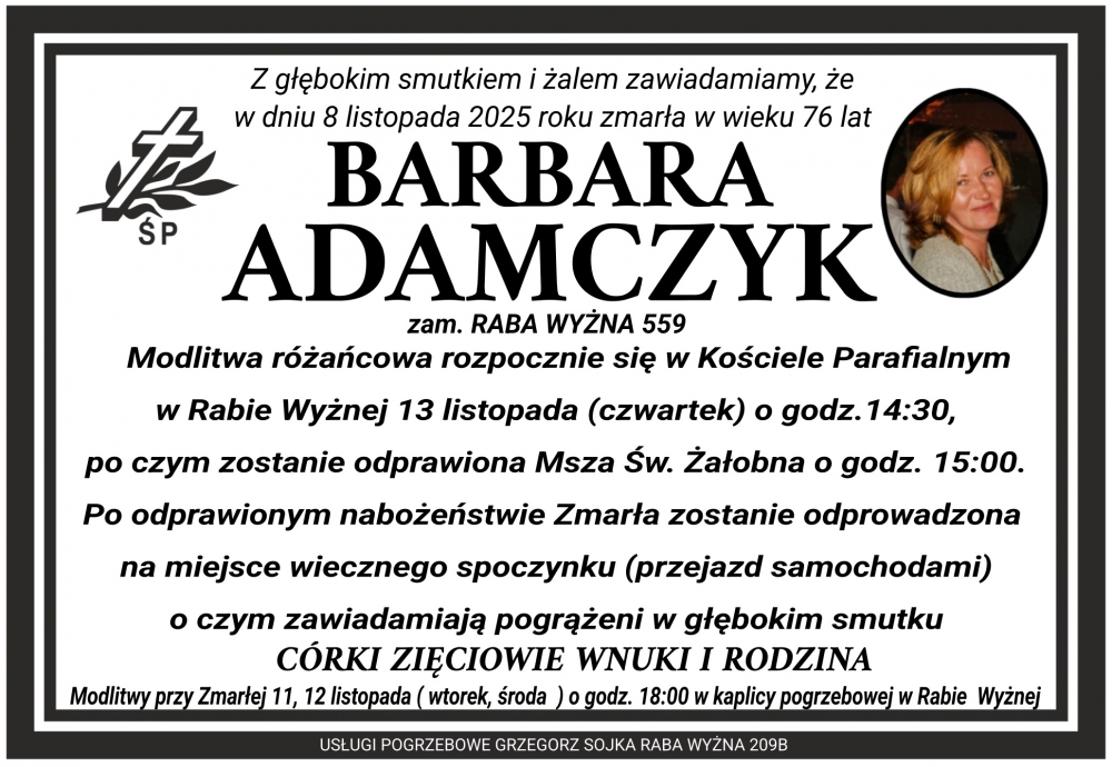 Barbara Adamczyk - Nekrologi - podhale24.pl