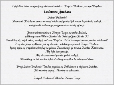 Podhale24.pl zastrzega sobie prawo do nie publikowania wspomnień, w szczególności tych nie związanych z profilem działu nekrologi, zawierających wulgaryzmy, wzywających do zachowań niezgodnych z prawem, obrażających osoby publiczne i prywatne, obrażających inne narodowości, rasy, religie itd, oraz te, bez możliwości telefonicznej lub mailowej weryfikacji ich autora.