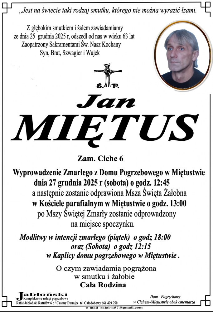 Podhale24.pl zastrzega sobie prawo do nie publikowania wspomnień, w szczególności tych nie związanych z profilem działu nekrologi, zawierających wulgaryzmy, wzywających do zachowań niezgodnych z prawem, obrażających osoby publiczne i prywatne, obrażających inne narodowości, rasy, religie itd, oraz te, bez możliwości telefonicznej lub mailowej weryfikacji ich autora.