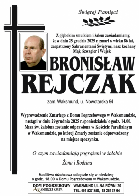 Podhale24.pl zastrzega sobie prawo do nie publikowania wspomnień, w szczególności tych nie związanych z profilem działu nekrologi, zawierających wulgaryzmy, wzywających do zachowań niezgodnych z prawem, obrażających osoby publiczne i prywatne, obrażających inne narodowości, rasy, religie itd, oraz te, bez możliwości telefonicznej lub mailowej weryfikacji ich autora.