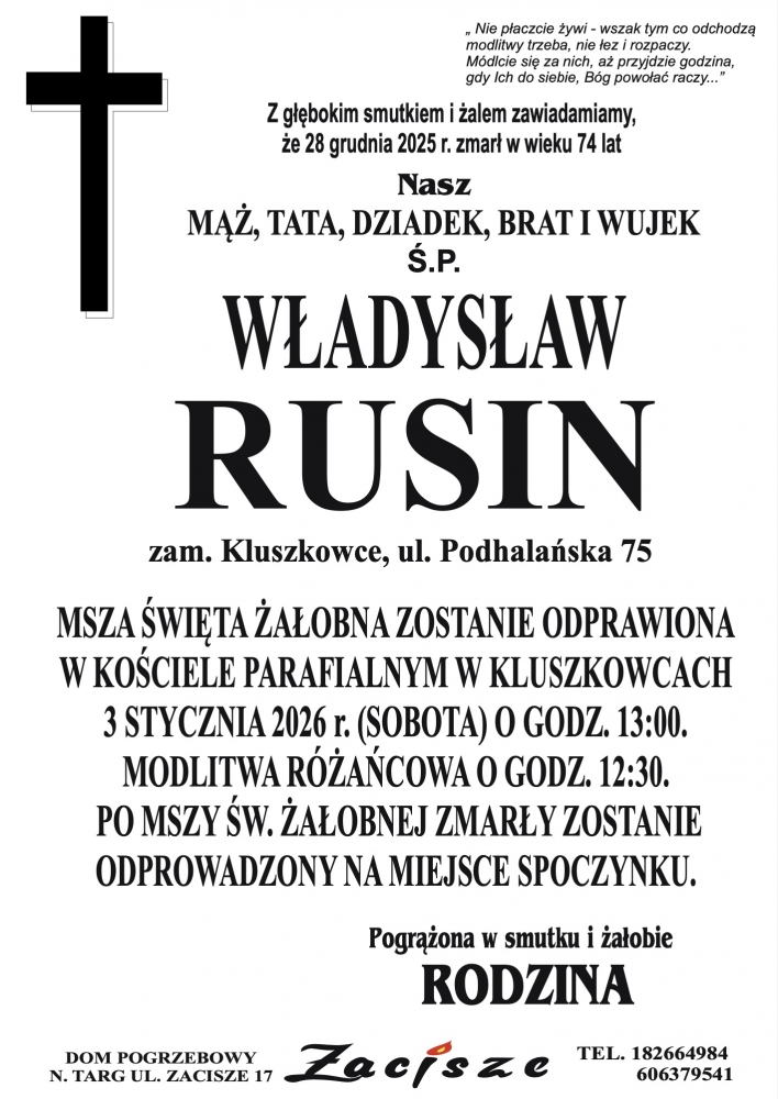 Podhale24.pl zastrzega sobie prawo do nie publikowania wspomnień, w szczególności tych nie związanych z profilem działu nekrologi, zawierających wulgaryzmy, wzywających do zachowań niezgodnych z prawem, obrażających osoby publiczne i prywatne, obrażających inne narodowości, rasy, religie itd, oraz te, bez możliwości telefonicznej lub mailowej weryfikacji ich autora.