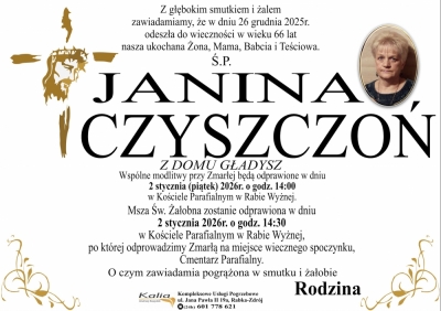 Podhale24.pl zastrzega sobie prawo do nie publikowania wspomnień, w szczególności tych nie związanych z profilem działu nekrologi, zawierających wulgaryzmy, wzywających do zachowań niezgodnych z prawem, obrażających osoby publiczne i prywatne, obrażających inne narodowości, rasy, religie itd, oraz te, bez możliwości telefonicznej lub mailowej weryfikacji ich autora.