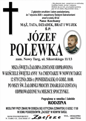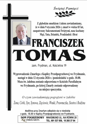 Podhale24.pl zastrzega sobie prawo do nie publikowania wspomnień, w szczególności tych nie związanych z profilem działu nekrologi, zawierających wulgaryzmy, wzywających do zachowań niezgodnych z prawem, obrażających osoby publiczne i prywatne, obrażających inne narodowości, rasy, religie itd, oraz te, bez możliwości telefonicznej lub mailowej weryfikacji ich autora.