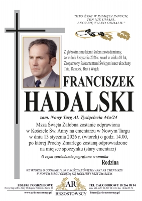 Podhale24.pl zastrzega sobie prawo do nie publikowania wspomnień, w szczególności tych nie związanych z profilem działu nekrologi, zawierających wulgaryzmy, wzywających do zachowań niezgodnych z prawem, obrażających osoby publiczne i prywatne, obrażających inne narodowości, rasy, religie itd, oraz te, bez możliwości telefonicznej lub mailowej weryfikacji ich autora.