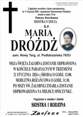 Podhale24.pl zastrzega sobie prawo do nie publikowania wspomnień, w szczególności tych nie związanych z profilem działu nekrologi, zawierających wulgaryzmy, wzywających do zachowań niezgodnych z prawem, obrażających osoby publiczne i prywatne, obrażających inne narodowości, rasy, religie itd, oraz te, bez możliwości telefonicznej lub mailowej weryfikacji ich autora.