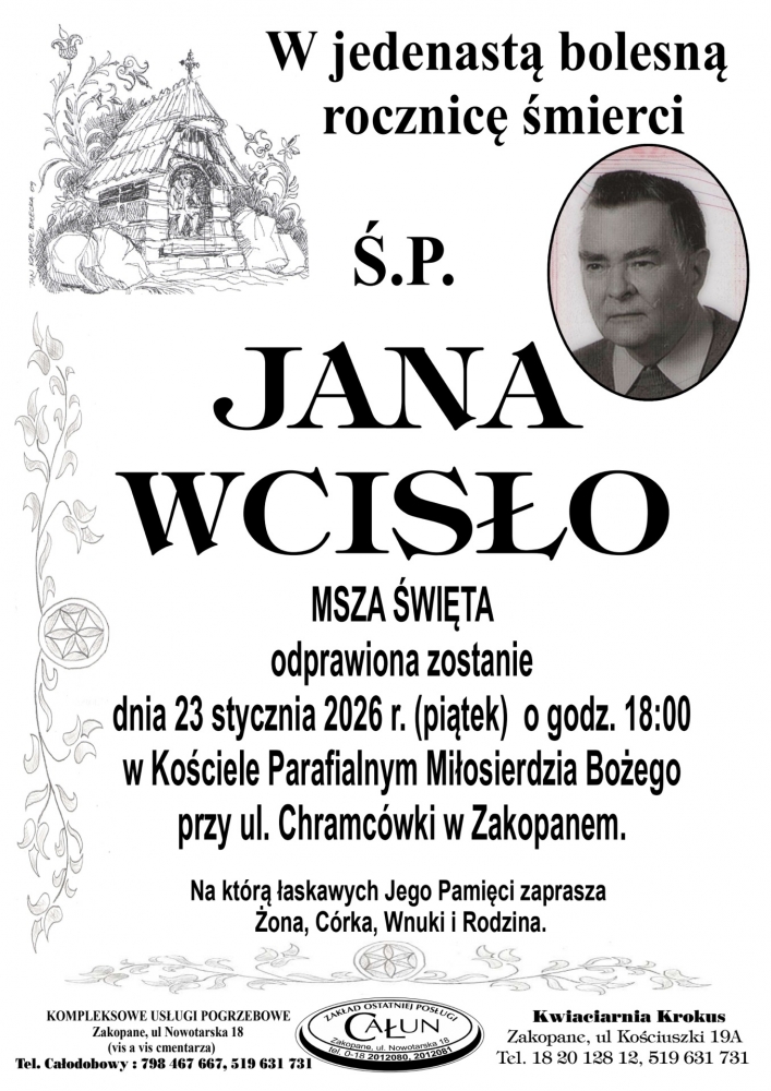 Podhale24.pl zastrzega sobie prawo do nie publikowania wspomnień, w szczególności tych nie związanych z profilem działu nekrologi, zawierających wulgaryzmy, wzywających do zachowań niezgodnych z prawem, obrażających osoby publiczne i prywatne, obrażających inne narodowości, rasy, religie itd, oraz te, bez możliwości telefonicznej lub mailowej weryfikacji ich autora.