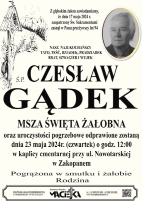 Podhale24.pl zastrzega sobie prawo do nie publikowania wspomnień, w szczególności tych nie związanych z profilem działu nekrologi, zawierających wulgaryzmy, wzywających do zachowań niezgodnych z prawem, obrażających osoby publiczne i prywatne, obrażających inne narodowości, rasy, religie itd, oraz te, bez możliwości telefonicznej lub mailowej weryfikacji ich autora.