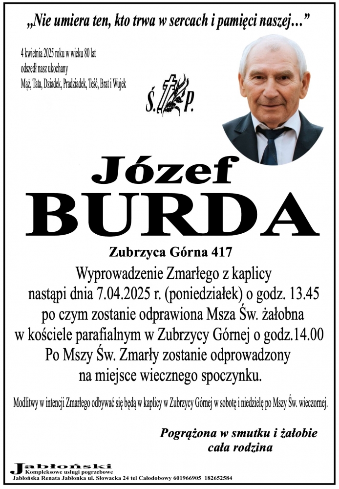 Podhale24.pl zastrzega sobie prawo do nie publikowania wspomnień, w szczególności tych nie związanych z profilem działu nekrologi, zawierających wulgaryzmy, wzywających do zachowań niezgodnych z prawem, obrażających osoby publiczne i prywatne, obrażających inne narodowości, rasy, religie itd, oraz te, bez możliwości telefonicznej lub mailowej weryfikacji ich autora.