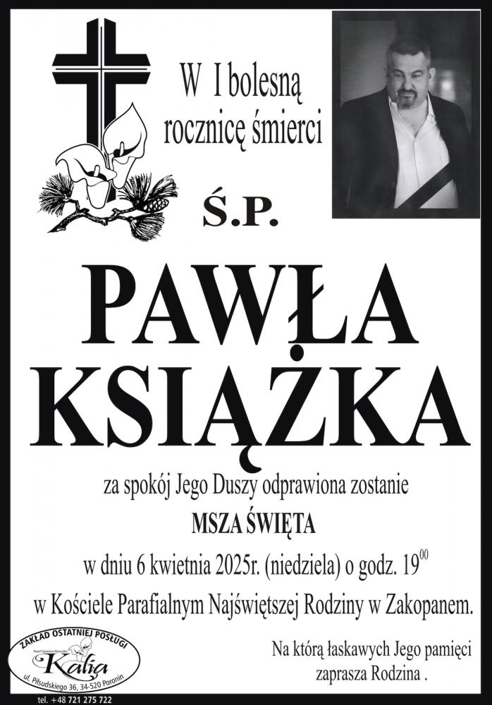 Podhale24.pl zastrzega sobie prawo do nie publikowania wspomnień, w szczególności tych nie związanych z profilem działu nekrologi, zawierających wulgaryzmy, wzywających do zachowań niezgodnych z prawem, obrażających osoby publiczne i prywatne, obrażających inne narodowości, rasy, religie itd, oraz te, bez możliwości telefonicznej lub mailowej weryfikacji ich autora.