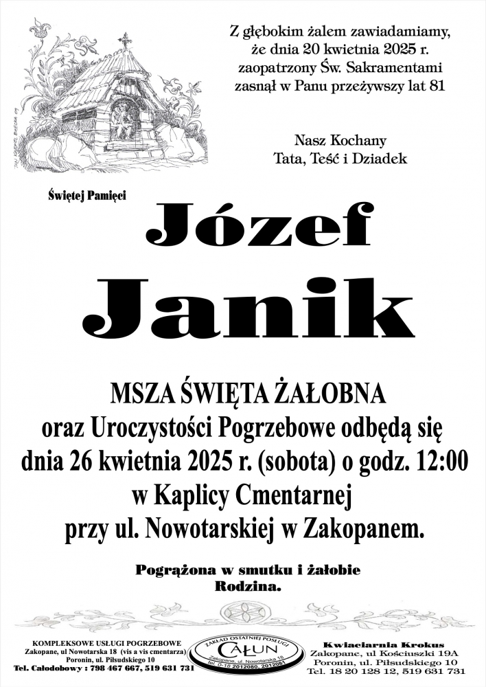 Podhale24.pl zastrzega sobie prawo do nie publikowania wspomnień, w szczególności tych nie związanych z profilem działu nekrologi, zawierających wulgaryzmy, wzywających do zachowań niezgodnych z prawem, obrażających osoby publiczne i prywatne, obrażających inne narodowości, rasy, religie itd, oraz te, bez możliwości telefonicznej lub mailowej weryfikacji ich autora.