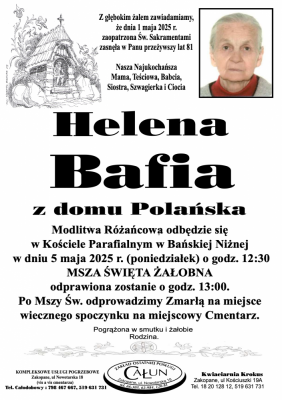 Podhale24.pl zastrzega sobie prawo do nie publikowania wspomnień, w szczególności tych nie związanych z profilem działu nekrologi, zawierających wulgaryzmy, wzywających do zachowań niezgodnych z prawem, obrażających osoby publiczne i prywatne, obrażających inne narodowości, rasy, religie itd, oraz te, bez możliwości telefonicznej lub mailowej weryfikacji ich autora.