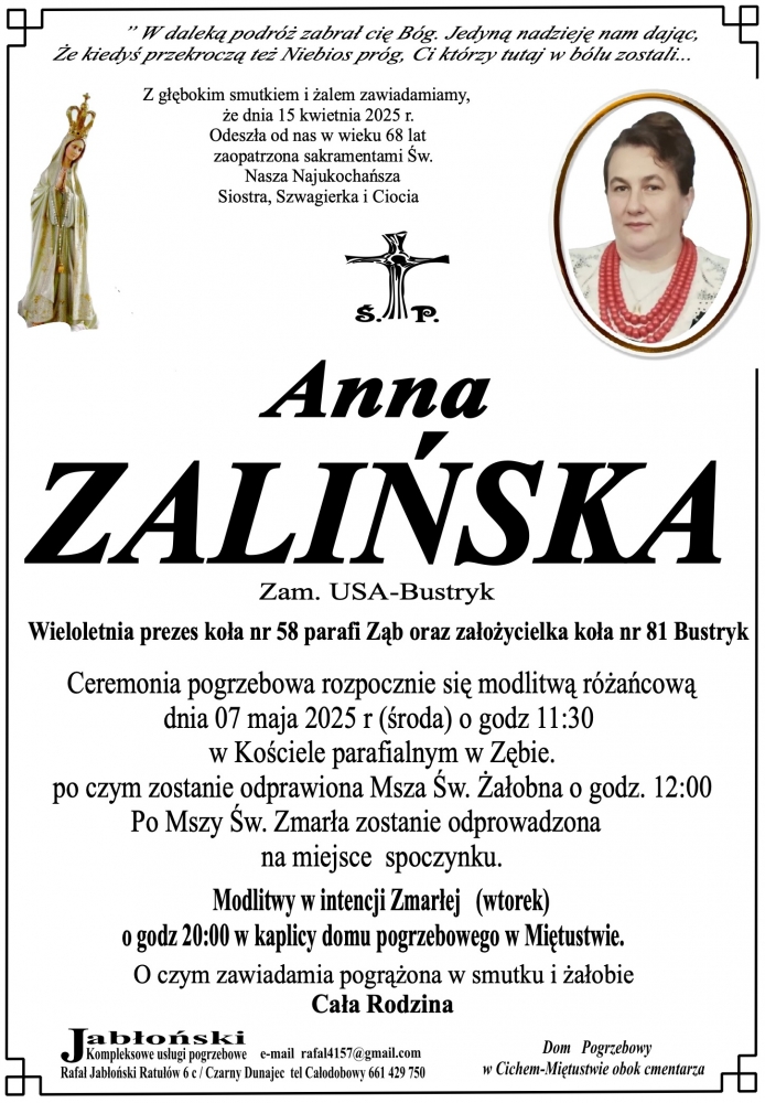 Podhale24.pl zastrzega sobie prawo do nie publikowania wspomnień, w szczególności tych nie związanych z profilem działu nekrologi, zawierających wulgaryzmy, wzywających do zachowań niezgodnych z prawem, obrażających osoby publiczne i prywatne, obrażających inne narodowości, rasy, religie itd, oraz te, bez możliwości telefonicznej lub mailowej weryfikacji ich autora.