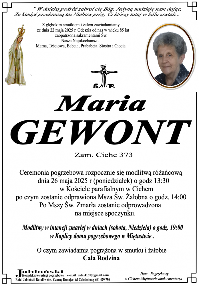 Podhale24.pl zastrzega sobie prawo do nie publikowania wspomnień, w szczególności tych nie związanych z profilem działu nekrologi, zawierających wulgaryzmy, wzywających do zachowań niezgodnych z prawem, obrażających osoby publiczne i prywatne, obrażających inne narodowości, rasy, religie itd, oraz te, bez możliwości telefonicznej lub mailowej weryfikacji ich autora.