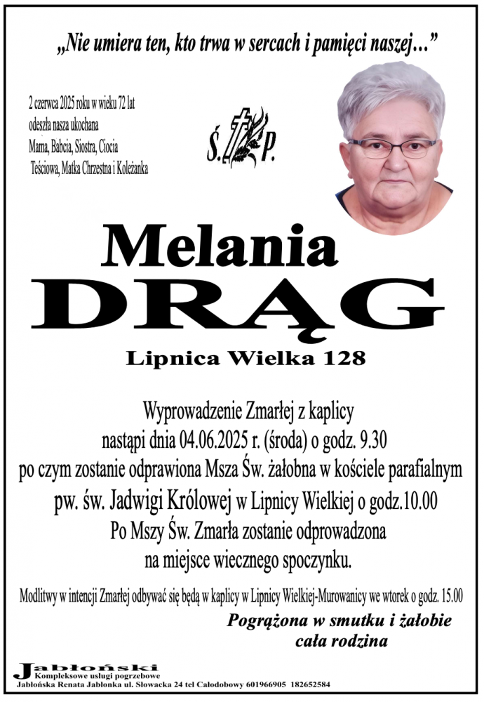Podhale24.pl zastrzega sobie prawo do nie publikowania wspomnień, w szczególności tych nie związanych z profilem działu nekrologi, zawierających wulgaryzmy, wzywających do zachowań niezgodnych z prawem, obrażających osoby publiczne i prywatne, obrażających inne narodowości, rasy, religie itd, oraz te, bez możliwości telefonicznej lub mailowej weryfikacji ich autora.