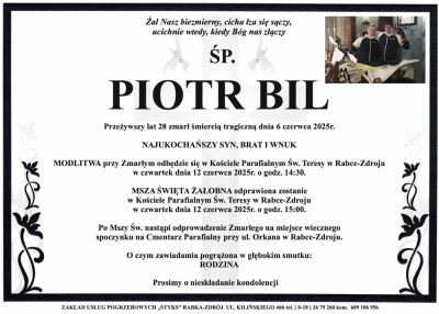 Podhale24.pl zastrzega sobie prawo do nie publikowania wspomnień, w szczególności tych nie związanych z profilem działu nekrologi, zawierających wulgaryzmy, wzywających do zachowań niezgodnych z prawem, obrażających osoby publiczne i prywatne, obrażających inne narodowości, rasy, religie itd, oraz te, bez możliwości telefonicznej lub mailowej weryfikacji ich autora.
