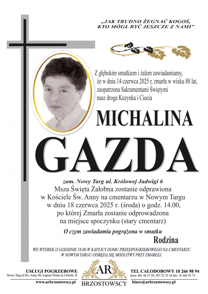 Podhale24.pl zastrzega sobie prawo do nie publikowania wspomnień, w szczególności tych nie związanych z profilem działu nekrologi, zawierających wulgaryzmy, wzywających do zachowań niezgodnych z prawem, obrażających osoby publiczne i prywatne, obrażających inne narodowości, rasy, religie itd, oraz te, bez możliwości telefonicznej lub mailowej weryfikacji ich autora.