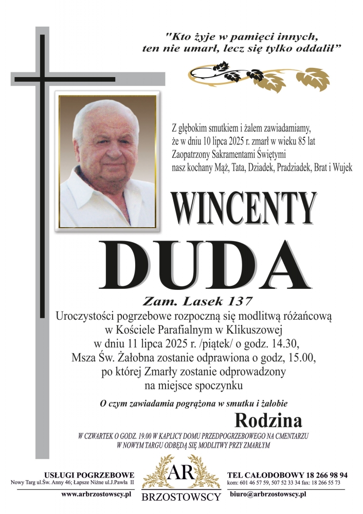 Podhale24.pl zastrzega sobie prawo do nie publikowania wspomnień, w szczególności tych nie związanych z profilem działu nekrologi, zawierających wulgaryzmy, wzywających do zachowań niezgodnych z prawem, obrażających osoby publiczne i prywatne, obrażających inne narodowości, rasy, religie itd, oraz te, bez możliwości telefonicznej lub mailowej weryfikacji ich autora.