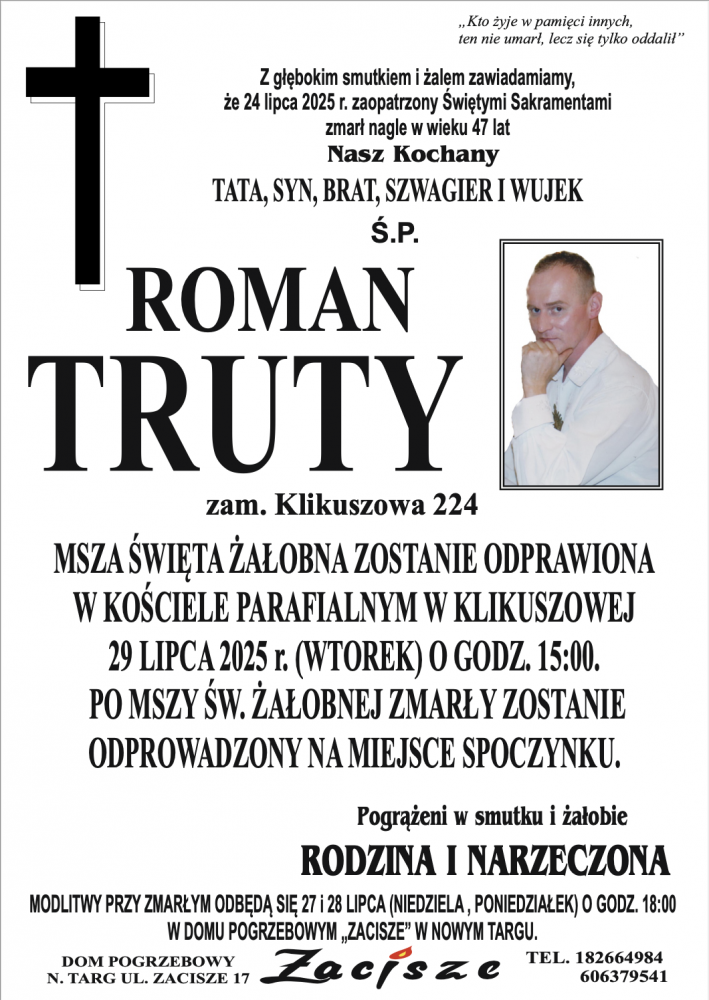 Podhale24.pl zastrzega sobie prawo do nie publikowania wspomnień, w szczególności tych nie związanych z profilem działu nekrologi, zawierających wulgaryzmy, wzywających do zachowań niezgodnych z prawem, obrażających osoby publiczne i prywatne, obrażających inne narodowości, rasy, religie itd, oraz te, bez możliwości telefonicznej lub mailowej weryfikacji ich autora.