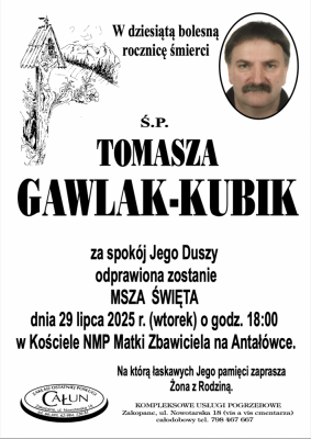Podhale24.pl zastrzega sobie prawo do nie publikowania wspomnień, w szczególności tych nie związanych z profilem działu nekrologi, zawierających wulgaryzmy, wzywających do zachowań niezgodnych z prawem, obrażających osoby publiczne i prywatne, obrażających inne narodowości, rasy, religie itd, oraz te, bez możliwości telefonicznej lub mailowej weryfikacji ich autora.