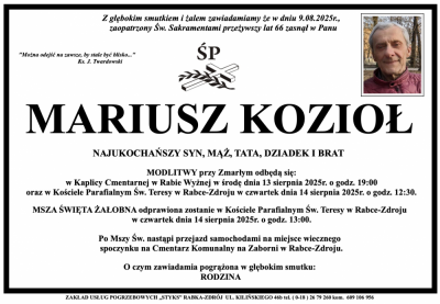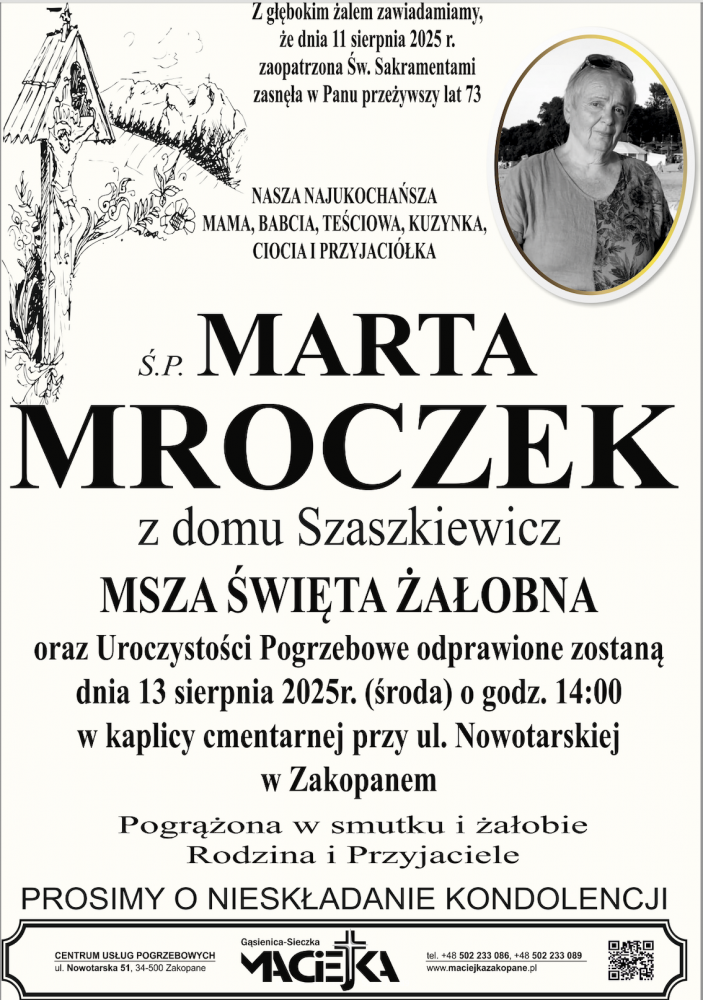 Podhale24.pl zastrzega sobie prawo do nie publikowania wspomnień, w szczególności tych nie związanych z profilem działu nekrologi, zawierających wulgaryzmy, wzywających do zachowań niezgodnych z prawem, obrażających osoby publiczne i prywatne, obrażających inne narodowości, rasy, religie itd, oraz te, bez możliwości telefonicznej lub mailowej weryfikacji ich autora.
