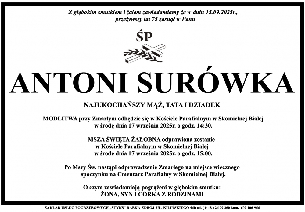 Podhale24.pl zastrzega sobie prawo do nie publikowania wspomnień, w szczególności tych nie związanych z profilem działu nekrologi, zawierających wulgaryzmy, wzywających do zachowań niezgodnych z prawem, obrażających osoby publiczne i prywatne, obrażających inne narodowości, rasy, religie itd, oraz te, bez możliwości telefonicznej lub mailowej weryfikacji ich autora.