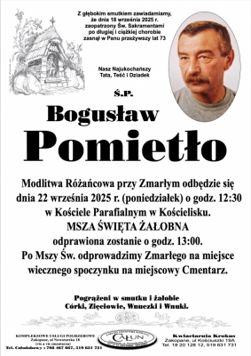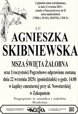 Podhale24.pl zastrzega sobie prawo do nie publikowania wspomnień, w szczególności tych nie związanych z profilem działu nekrologi, zawierających wulgaryzmy, wzywających do zachowań niezgodnych z prawem, obrażających osoby publiczne i prywatne, obrażających inne narodowości, rasy, religie itd, oraz te, bez możliwości telefonicznej lub mailowej weryfikacji ich autora.